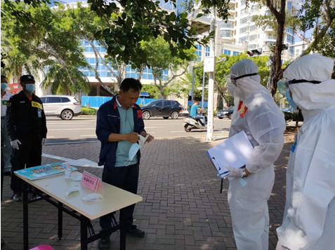 通信联络组上报美兰区防疫防控指挥部、海旅集团,并在路口等待引导疫情防控指挥部救护人员抵达警务室。